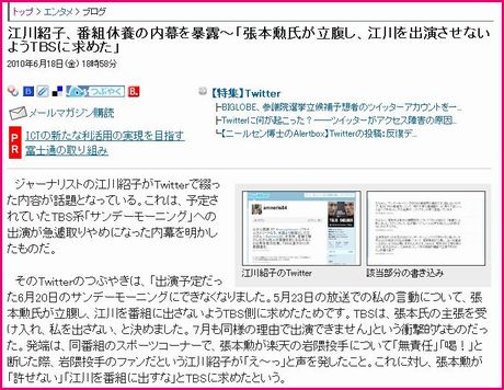 >>>>私がいきさつを明らかにしたのは(中略)これで私が黙っていれば、次にまた同じようなことが起きかねない、と思ったから」という江川紹子だが、果たして張本勲やTBSからこの件に対し何らかの発表があるのか。注目されるところだ。