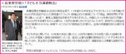 >>長妻昭厚生労働相は8日夜の再任会見で、11年度から中学生以下の子ども1人につき月額2万6000円を支給するとした衆院選マニフェスト(政権公約)の実現について「現金、現物を問わず非常に難しい」と述べ、事実上満額支給を断念する考えを示した。