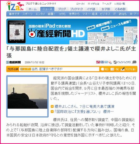 「「与那国島に陸自配置を」領土議連で櫻井よしこ氏が主張」:イザ!