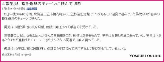 4歳男児、指を遊具のチェーンに挟んで切断(読売新聞) - Yahoo!ニュース http://headlines.yahoo.co.jp/hl?a=20100606-00000487-yom-soci