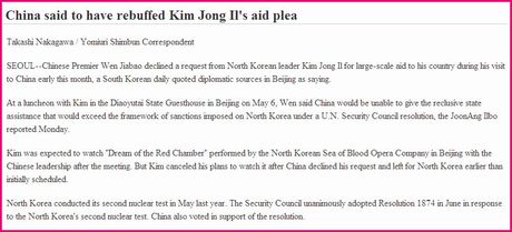 China said to have rebuffed Kim Jong Il's aid plea