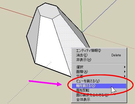SketchUp の尺度ツールで立体ではなく面を選択したいときありますよね 普通はこんな感じで、立体に選択されてしまいます。 選択したい面を右クリック、そして「軸をそろえる(X)」を選択 面が選択されました。